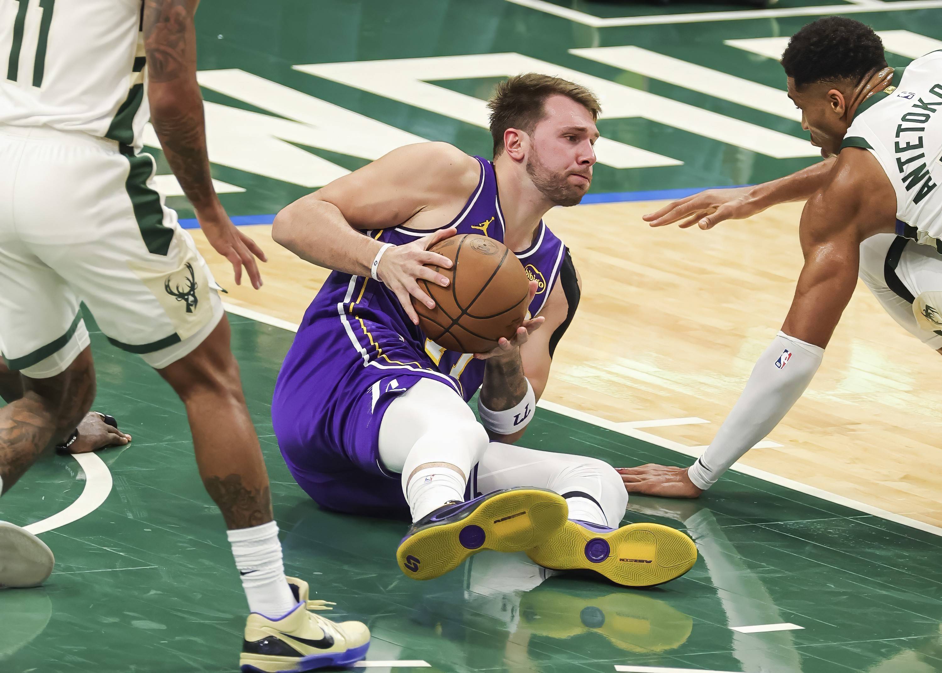 11月15日,雄鹿队球员阿德托昆博(右)与湖人队球员东契奇在比赛中拼抢。 新华社发(乔尔·莱纳摄)
