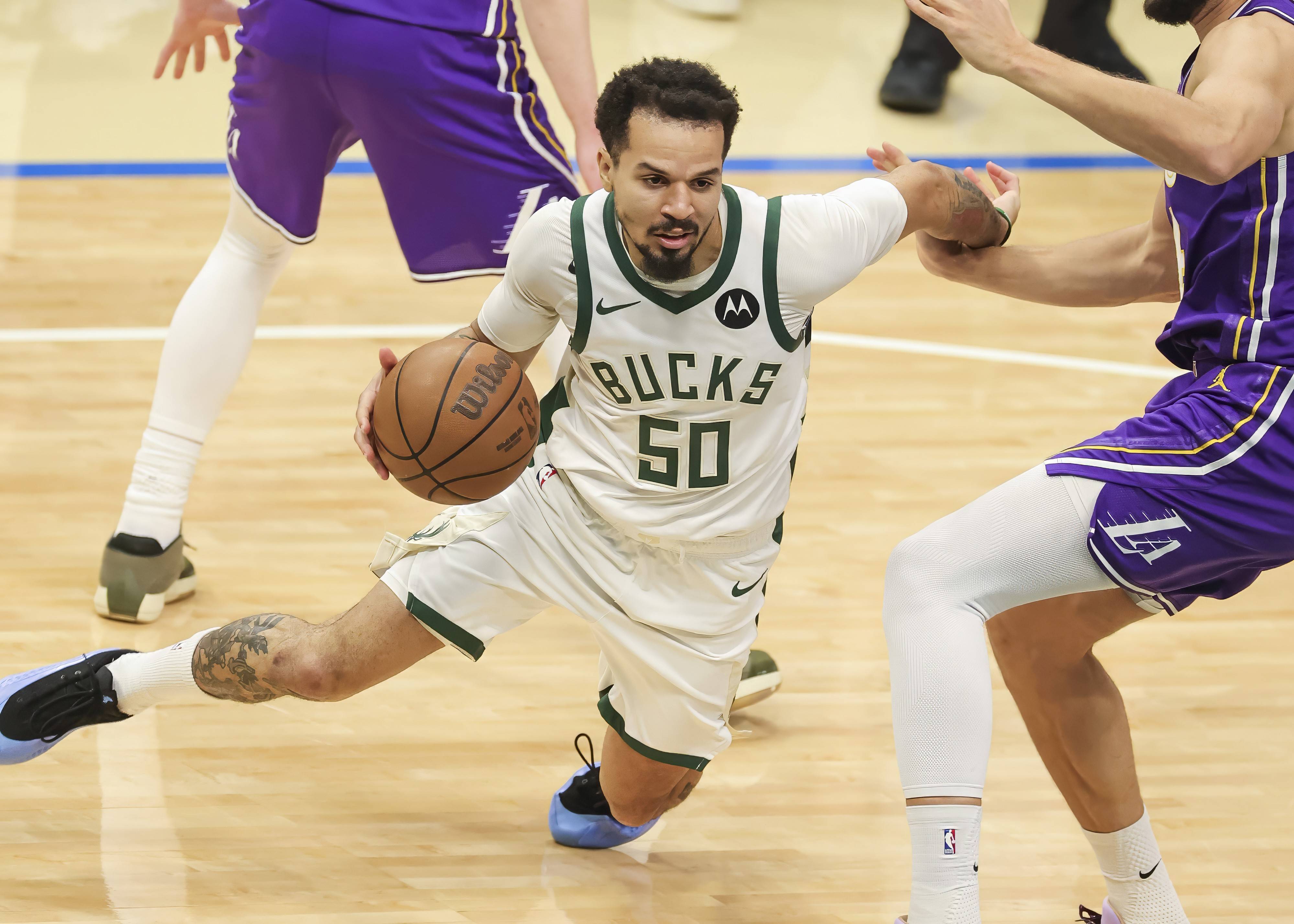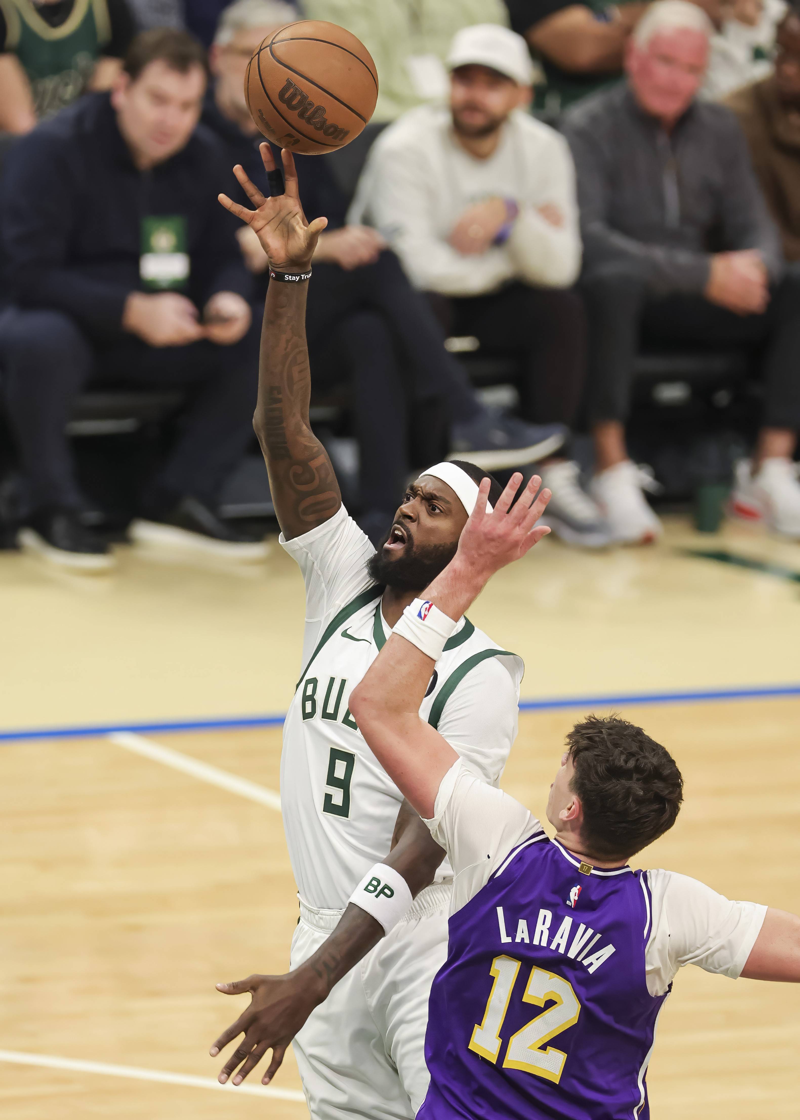 11月15日,雄鹿队球员波蒂斯(左)与湖人队球员拉拉维亚在比赛中拼抢。 新华社发(乔尔·莱纳摄)